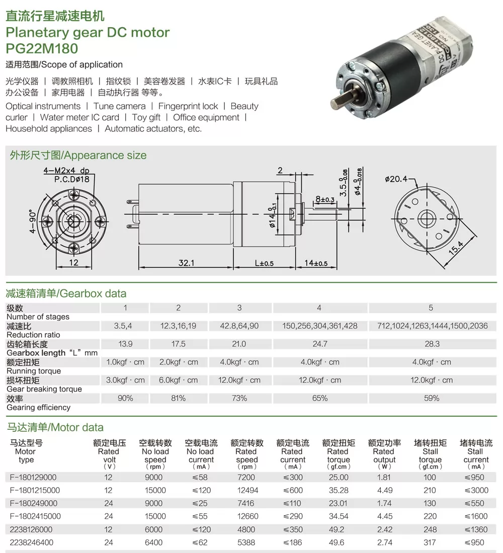PG22180 series Gearmotor consists of 22mm planetary gearbox and F-180 series brushed motor. The gearmotor can be customized for different speeds and torque to meet application requirements, high performance, high precision, small size, easy assembly, and disassembly.