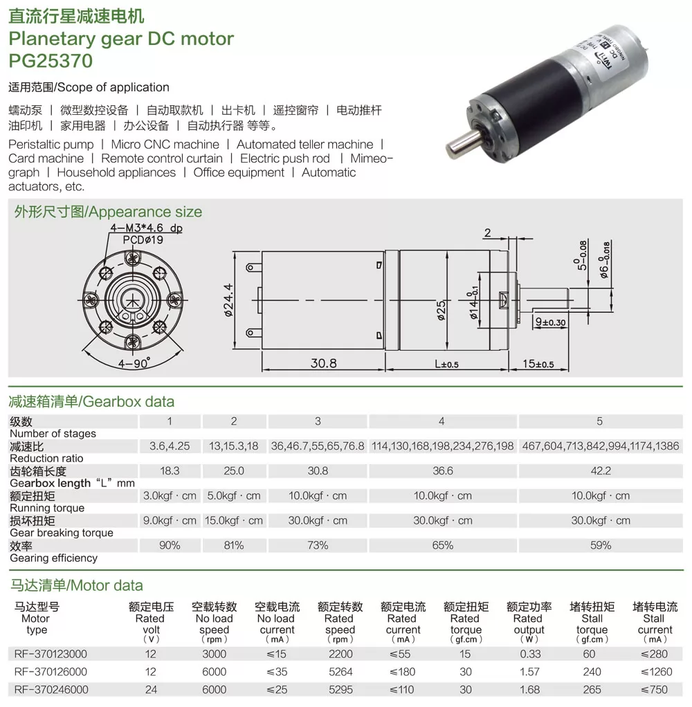 PG25370 series Gearmotor consists of 25mm planetary gearbox and RF-370 series brushed motor. The gearmotor can be customized for different speeds and torque to meet application requirements, high performance, high precision, small size, easy assembly, and disassembly.